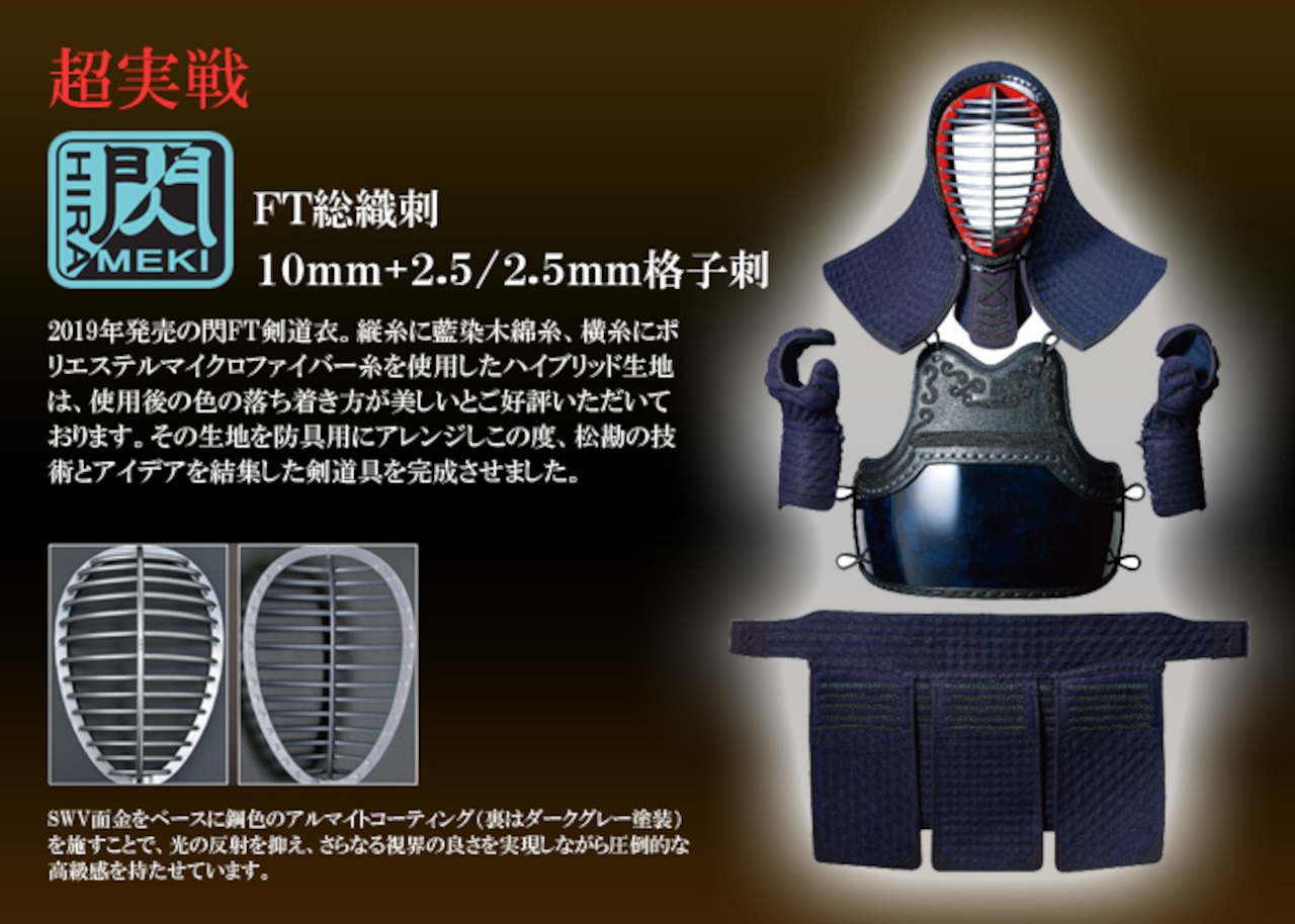 2019年発売の閃FT剣道衣。縦糸に藍染木綿糸、横糸にポリエステルマイクロファイバー糸を使用したハイブリッド生地は、使用後の色の落ち着き方が美しいとご好評いただいております。その生地を防具用にアレンジしこの度、松勘の技術とアイデアを結集した剣道具を完成させました。
